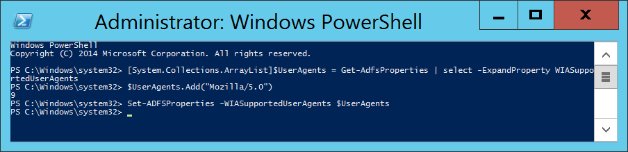 Set-ADFSProperties -WIASupportedUserAgents ((Get-ADFSProperties | Select-Object -ExpandProperty WIASupportedUserAgents) + "Mozilla/5.0")