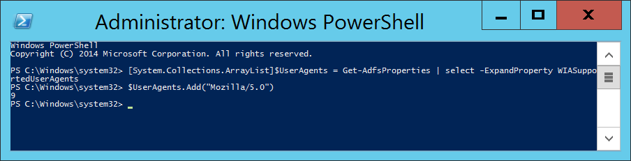 [System.Collections.ArrayList]$UserAgents = Get-AdfsProperties | select -ExpandProperty WIASupportedUserAgents