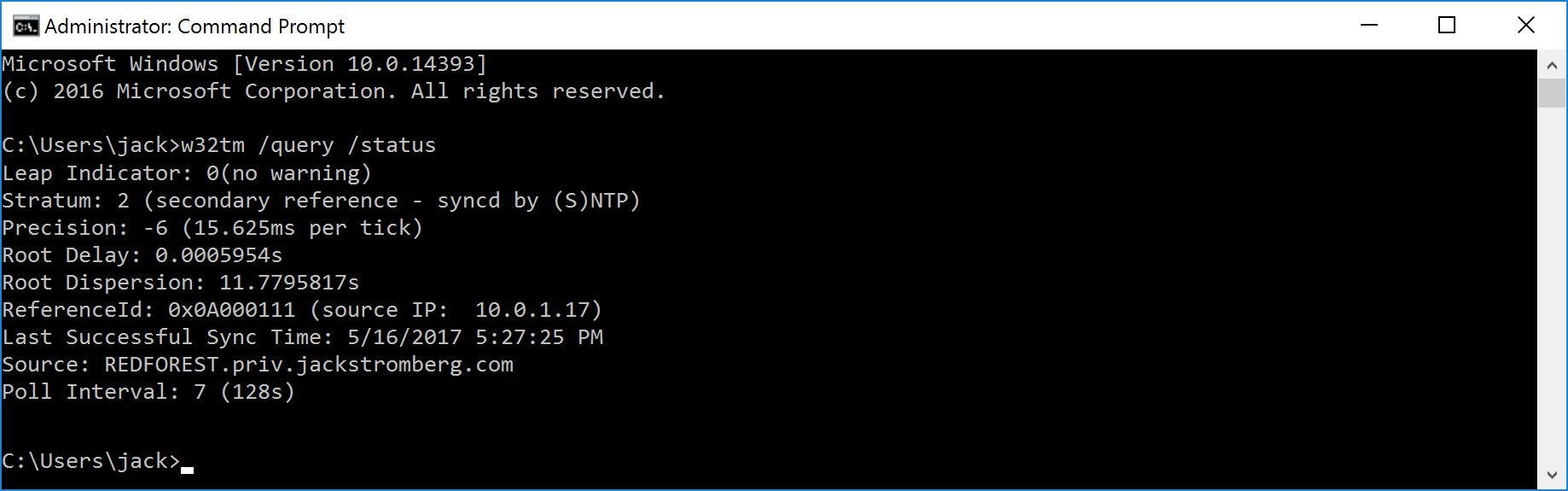 - Validate that the Source is now pointing to your NTP server/domain by running the following command: w32tm /query /status