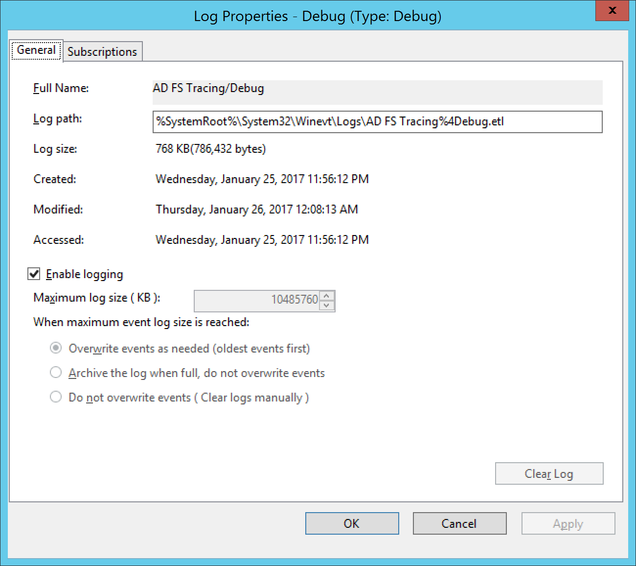 Typically, the screenshot below is an example of the incorrect settings used; make sure that Enable Logging is unchecked and is Do not overwrite events ( Clear logs manually ) is checked