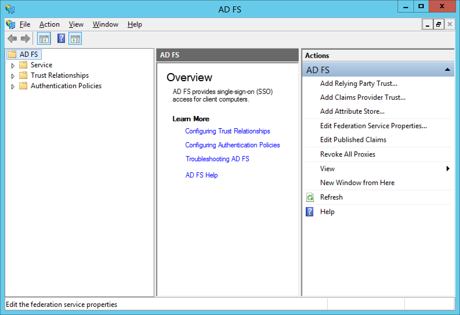 - In AD FS Management, select AD FS in the top left and select Edit Federation Service Properties...