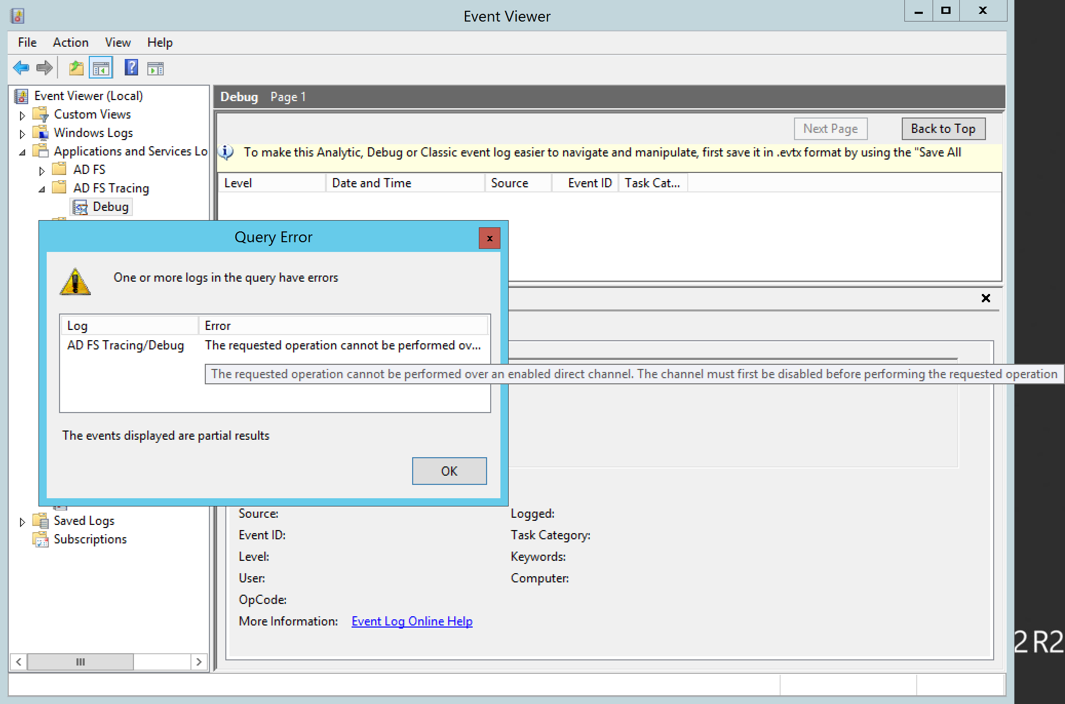 AD FS Debug - The requested operation cannot be performed over an enabled direct channel. The channel must first be disabled before performing the requested operation