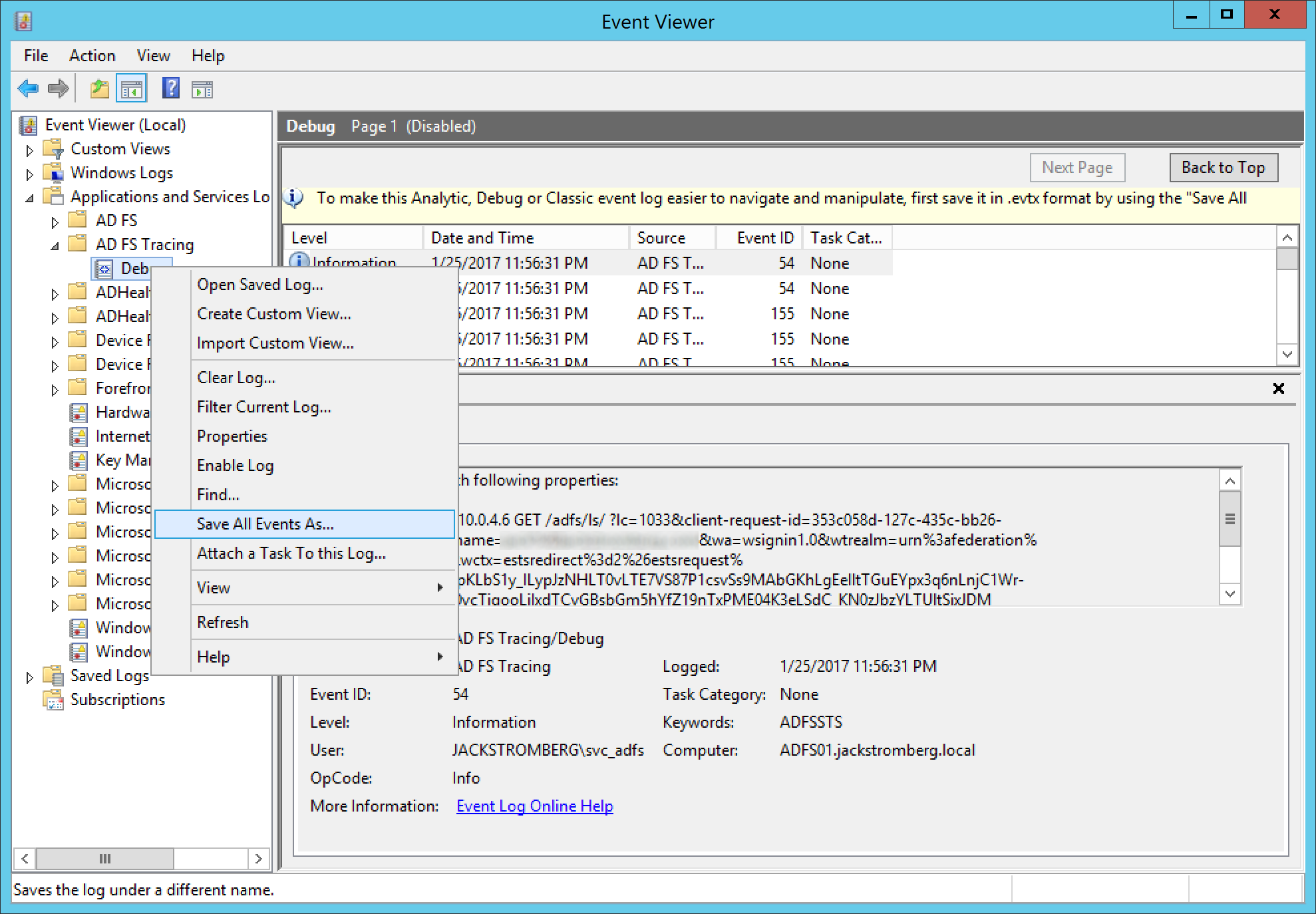 - Optional Step: Right click on Debug and select Save All Events As... This will export to a evtx file, in which this can be sent to another team for analysis or you can reference the logs at a later time.
