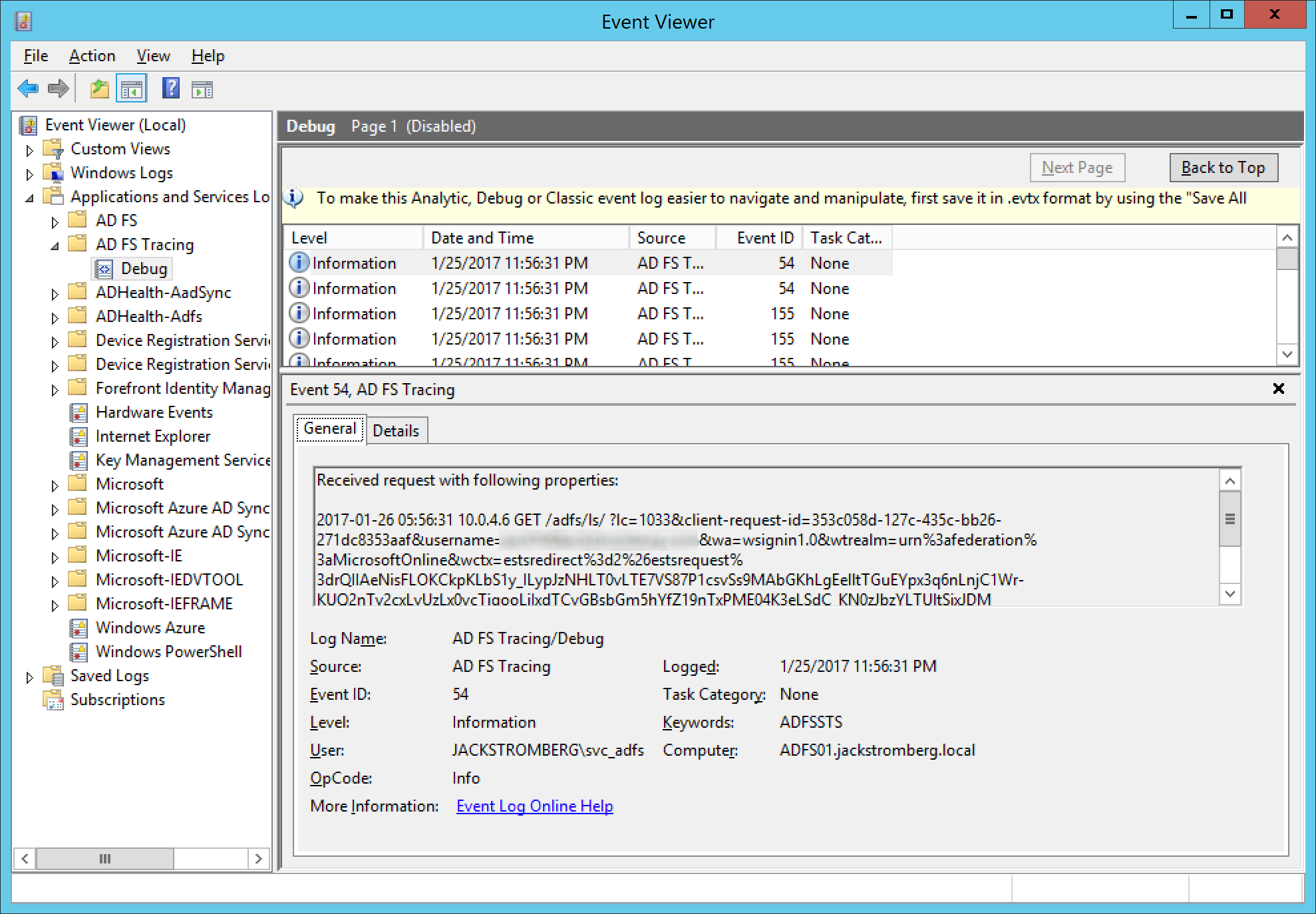 - Expand Applications and Services Logs, expand AD FS Tracing, and select Debug