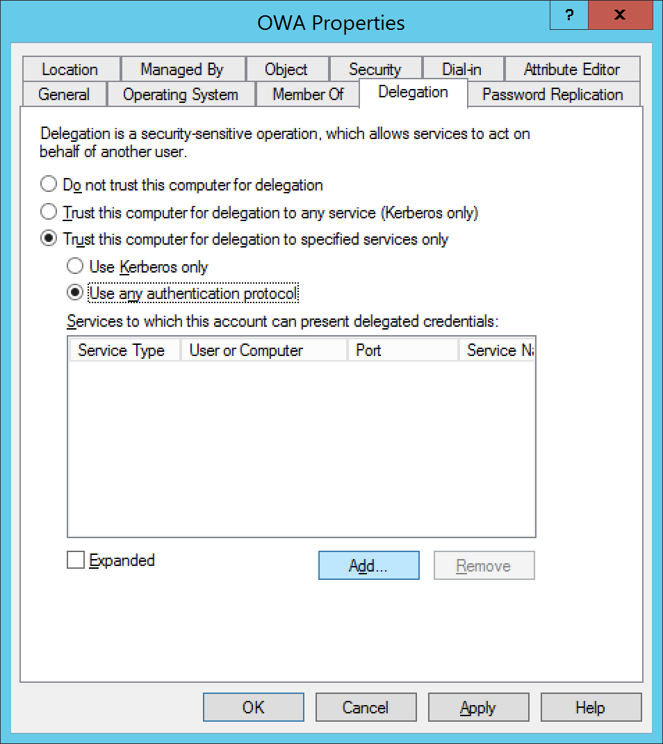 - Select the Delegation tab, select Trust this computer for delegation to specified services only, check Use any authentication protocol, and click on Add...