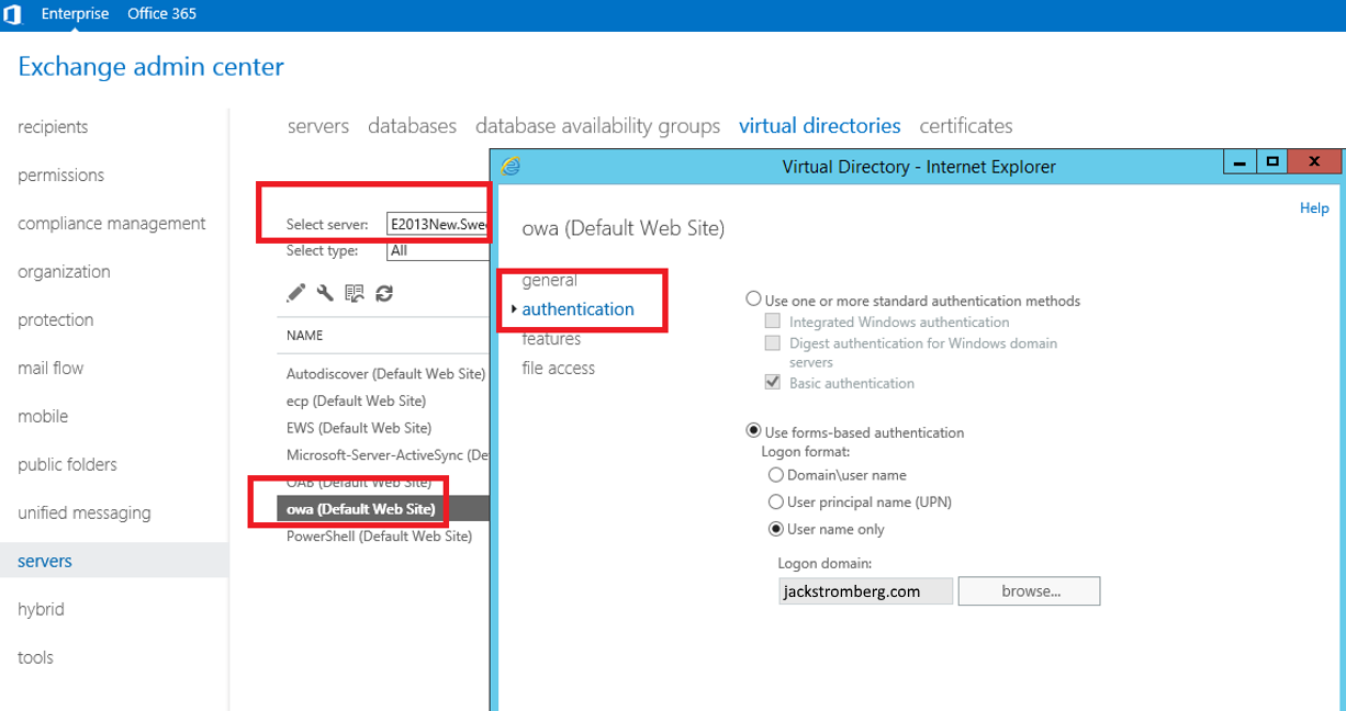 - Expand Server Configuration, select Client Access, under Outlook Web App, right click on your web app and select Properties