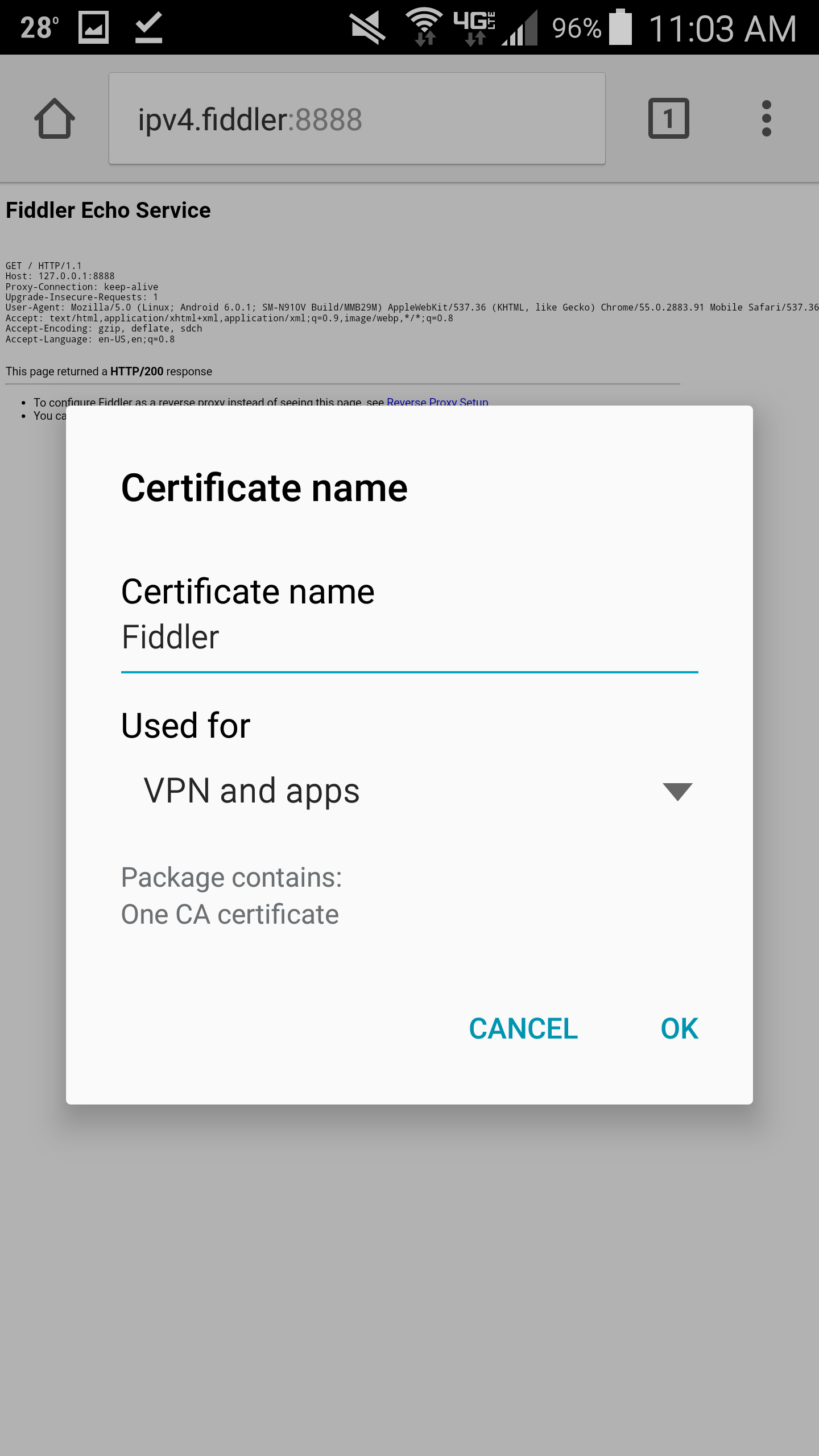 - Once the certificate has downloaded, type Fiddler as the Certificate name and click OK