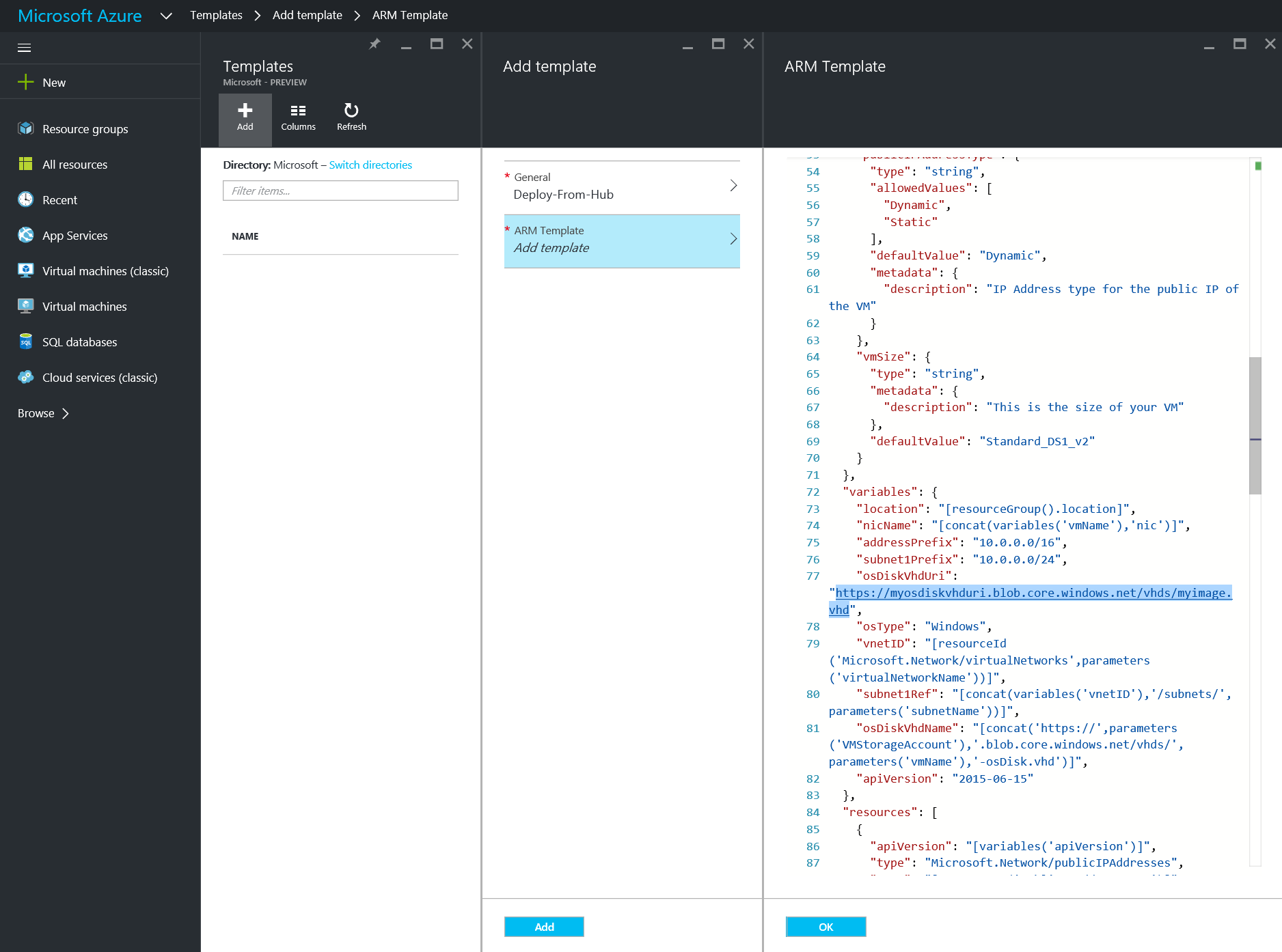 4. Paste in the template above, ensure you change the osDiskVhdUri, and click OK
