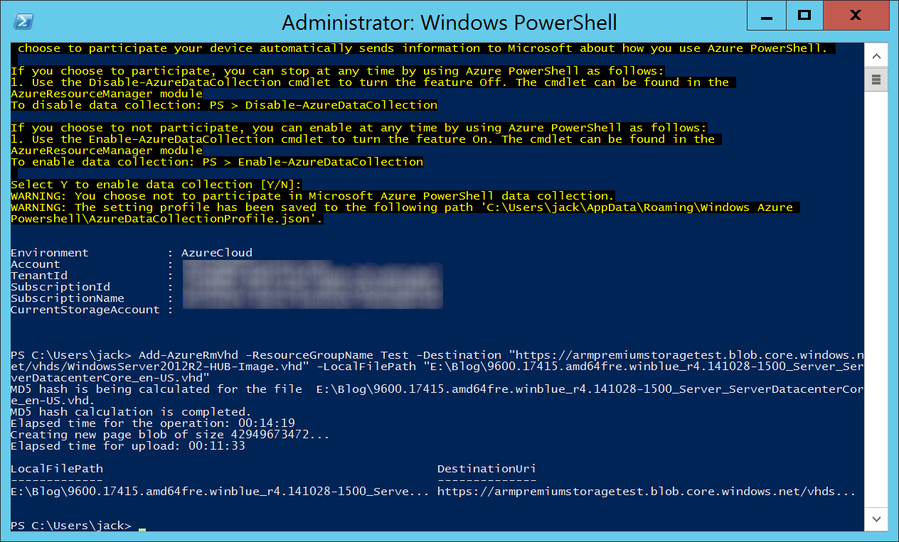 Add-AzureRmVhd -ResourceGroupName Test -Destination "https://armpremiumstoragetest.blob.core.windows.net/vhds/WindowsServer2012R2-HUB-Image.vhd" -LocalFilePath "E:\Blog\9600.17415.amd64fre.winblue_r4.141028-1500_Server_ServerDatacenterCore_en-US.vhd"